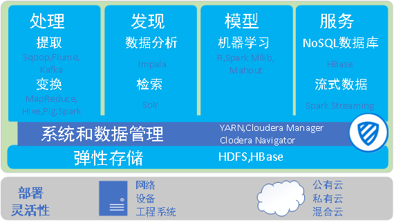 Hadoop系统集成了大数据主要技术体制,包括数据存储、数据处理、系统管理和其他组件,提供了强大的系统级解决方案,成为大数据处理的核心技术,HBase、HDFS和MapReduce构成了 Hadoop的核心技术。HBase提供了高效实时分布式数据库、HDFS代表了 Hadoop大数据平台最基本的存储能力,实现对分布式存储的底层支持;MapReduce代表了 Hadoop大数据平台最基本的计算能力,实现对分布式并行任务处理的程序支持,共同支撑了 Hadoop主要体系架构。下图是Cloudera公司给出了一种Hadoop的开源实现方案。