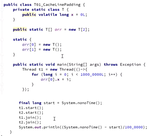 package com.mashibing.juc.c_028_FalseSharing; public class T02_CacheLinePadding { private static class Padding { public volatile long p1, p2, p3, p4, p5, p6, p7; // } private static class T extends Padding { public volatile long x = 0L; } public static T[] arr = new T[2]; static { arr[0] = new T(); arr[1] = new T(); } public static void main(String[] args) throws Exception { Thread t1 = new Thread(()->{ for (long i = 0; i < 1000_0000L; i++) { arr[0].x = i; } }); Thread t2 = new Thread(()->{ for (long i = 0; i < 1000_0000L; i++) { arr[1].x = i; } }); final long start = System.nanoTime(); t1.start(); t2.start(); t1.join(); t2.join(); System.out.println((System.nanoTime() - start)/100_0000); } }