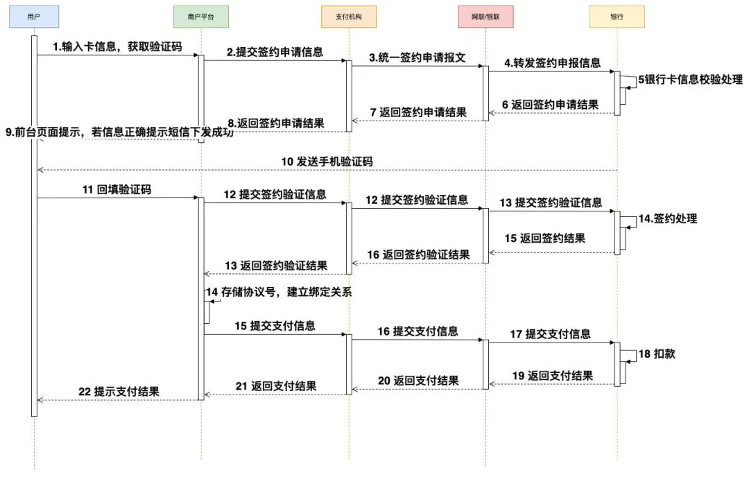 签约过程需要传入银行卡信息,银行卡号,户名,身份证号,手机号,信用卡的话可能还需要传入 cvv2 以及有效期。这个过程主要是为了鉴权,校验银行卡信息的正确性。