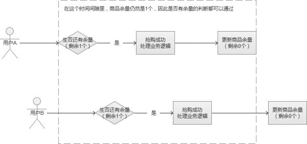 在上面的这个图中,就导致了并发用户B也“抢购成功”,多让一个人获得了商品。这种场景,在高并发的情况下非常容易出现。