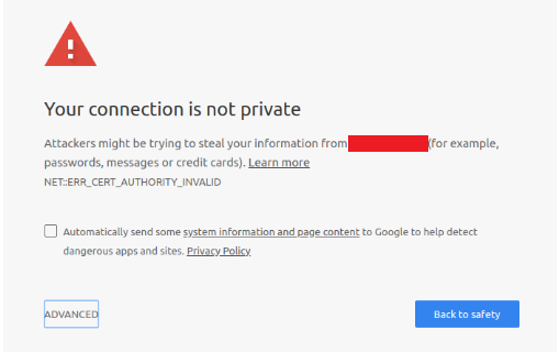 这样就免受中间人攻击了,因为假如有中间人修改了证书的内容(如将证书中的公钥替换成自己的公钥),那么将获得不同的哈希值,从而两个哈希值不匹配导致验证失败。如果要绕过这个机制,中间人必须要也替换签名,使签名也相匹配。而做到这一点就需要破解到了根证书的密钥(而这是不可能的,中间人必然会失败)。浏览器会出现以下画面,告诉你正在遭受中间人攻击,因为证书被篡改了: