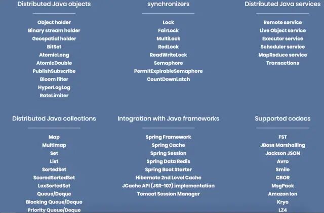 但是redisson这个客户端可有点厉害,笔者在官网截了仅仅是一部分的图: