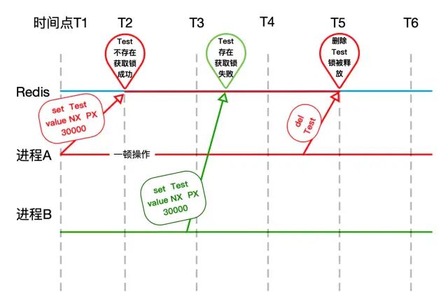 上图是笔者画的setnx大致原理,主要依托了它的key不存在才能set成功的特性,进程A拿到锁,在没有删除锁的Key时,进程B自然获取锁就失败了。那么为什么要使用PX 30000去设置一个超时时间? 是怕进程A不讲道理啊,锁没等释放呢,万一崩了,直接原地把锁带走了,导致系统中谁也拿不到锁。就算这样,还是不能保证万无一失。