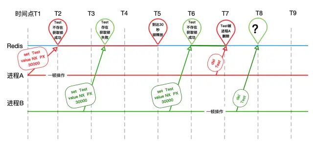 还是刚才那张图,将T5时刻改成了锁超时,被redis释放。进程B在T6开开心心拿到锁不到一会,进程A操作完成,回手一个del,就把锁释放了。当进程B操作完成,去释放锁的时候(图中T8时刻):找不到锁其实还算好的,万一T7时刻有个进程C过来加锁成功,那么进程B就把进程C的锁释放了。以此类推,进程C可能释放进程D的锁,进程D....(禁止套娃),具体什么后果就不得而知了。