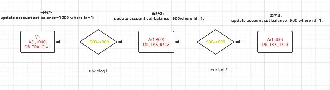 每次事务更新数据时,将会生成一个新的数据版本,然后会把当前的事务 id 赋值给当前记录的 DB_TRX_ID。并且数据更新记录(1,1000---->1,900)将会记录在 undo log(回滚日志)中,然后使用当前记录的 DB_ROLL_PTR 指向 und olog。