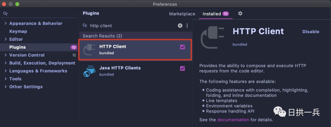 HTTP Client 是 IDEA 默认绑定好并启用的插件,如果你那里没有启用,按照下图启用就好