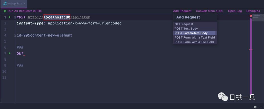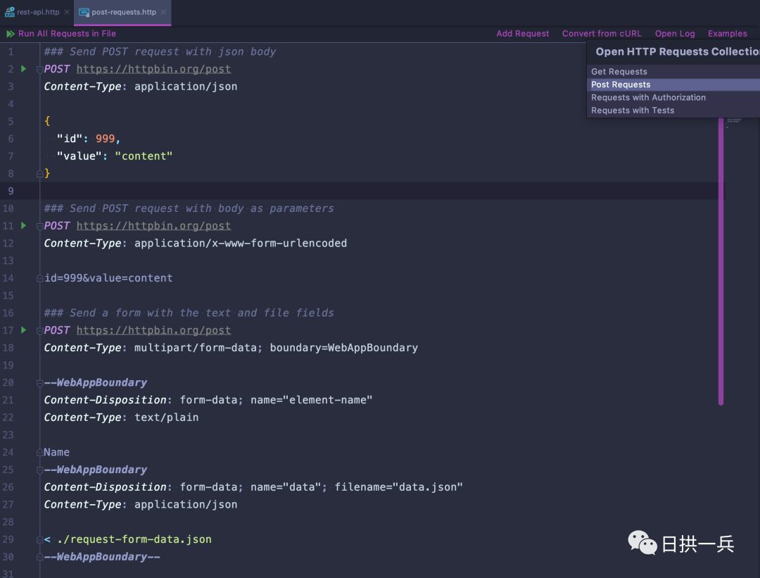 都知道,通常写一个完整的请求需要写好多内容,贴心的 IDEA 给我们提供了模版,我们只需要在 Examples 中找模版就可以啦,比如找 POST 请求的模版,选取合适的拷贝过去就可以,so easy~~~