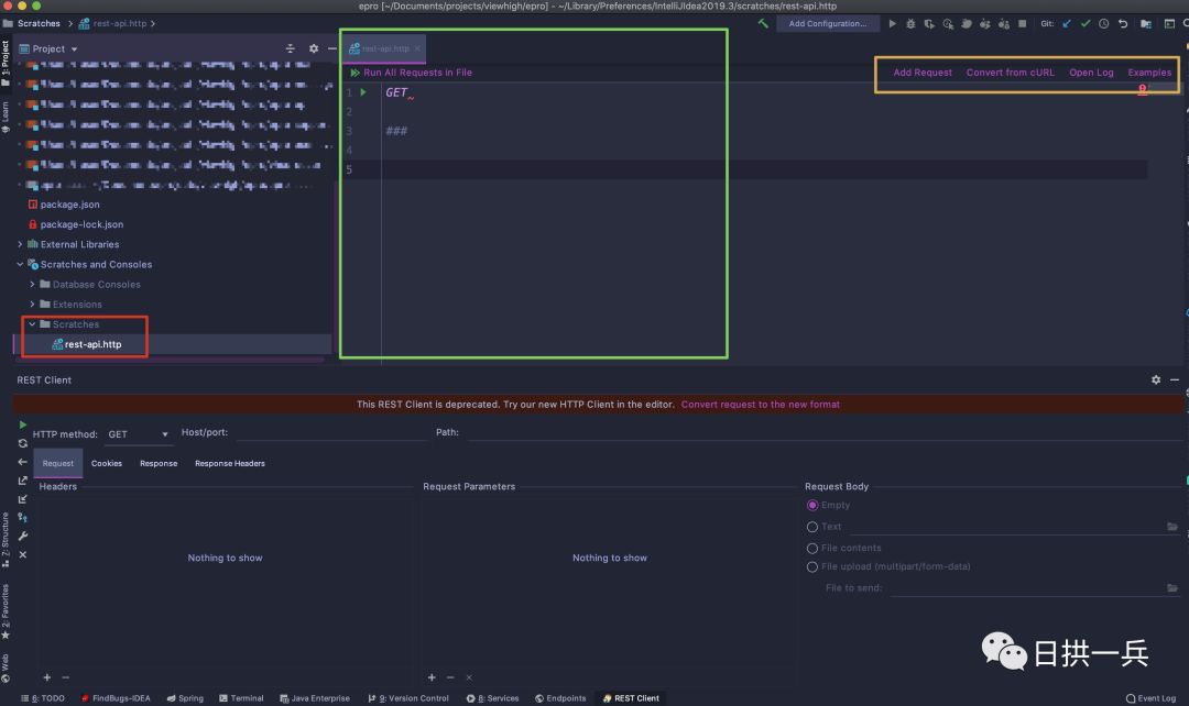默认会创建一个名为 rest-api.http 的文件,该文件被存储在 Scratches 文件夹下,为了突出主角光环,关于 Scratch Files 请官网自行查看 (继续向下看不影响理解的),黄色框线的功能也非常有用,继续向下看