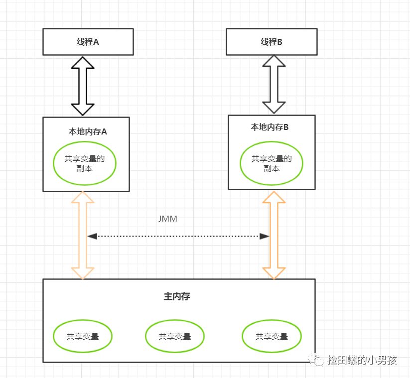 Java内存模型规定了所有的变量都存储在主内存中,每条线程还有自己的工作内存,线程的工作内存中保存了该线程中是用到的变量的主内存副本拷贝,线程对变量的所有操作都必须在工作内存中进行,而不能直接读写主内存。不同的线程之间也无法直接访问对方工作内存中的变量,线程间变量的传递均需要自己的工作内存和主存之间进行数据同步进行。