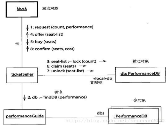 2. 协作图: 协作图是对在一次交互中有意义的对象和对象间的链建模,对象和关系只有在交互的语境中才有意义。协作图用几何排列来表示交互作用中的各角色。附在类元角色上的箭头表示消息,消息的发生顺序用编号数字表示。