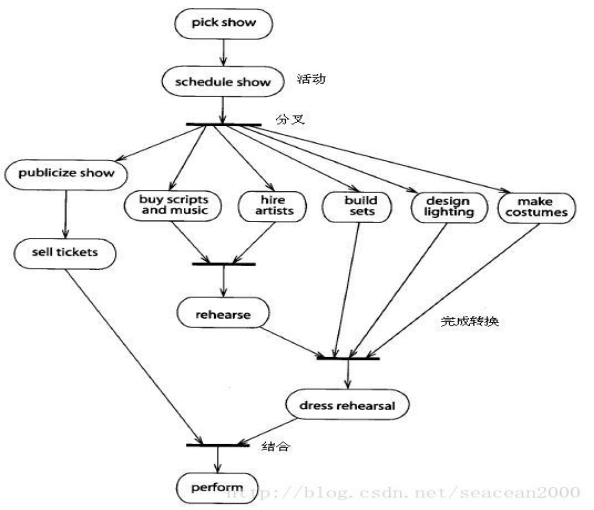 3.活动试图:活动视图是用于显示执行某个计算过程中的运算活动的状态机的一种变形。活动状态表现了一项活动:工作流的步骤或操作的执行。活动图描述了顺序和并发活动分组。活动视图表达为活动图。