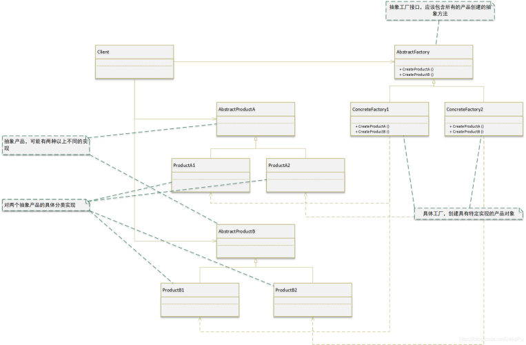 - 抽象工厂模式经常和工厂方法模式共同组合来应对“对象创建”的需求变化。