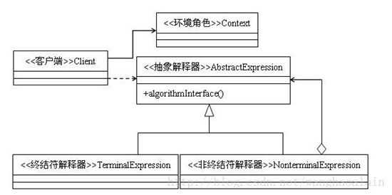 定义语言(使用规定格式和语法的代码)的文法,并且建立一个解释器来解释该语言中的句子。它属于类行为模式。解释器模式提供一种简单方法来执行语法且容易修改和扩展。一般系统中很多类使用相似的语法,可以使用一个解释器来代替每一个规则实现一个解释器。在解释器中不同规则是由不同类实现的,从而使添加一个新的语法规则简单化,但对于复杂语法难以维护。
