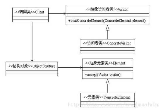 (1)Visitor(访问者):为该对象结构中每一个ConcreteElement声明一个Visit操作,该操作的名称和特征标志了发送Visit请求给该标识者的那个类,使访问者可以确定正被访问元素的具体的类。这样访问者就可以通过该元素的特定接口直接访问它。