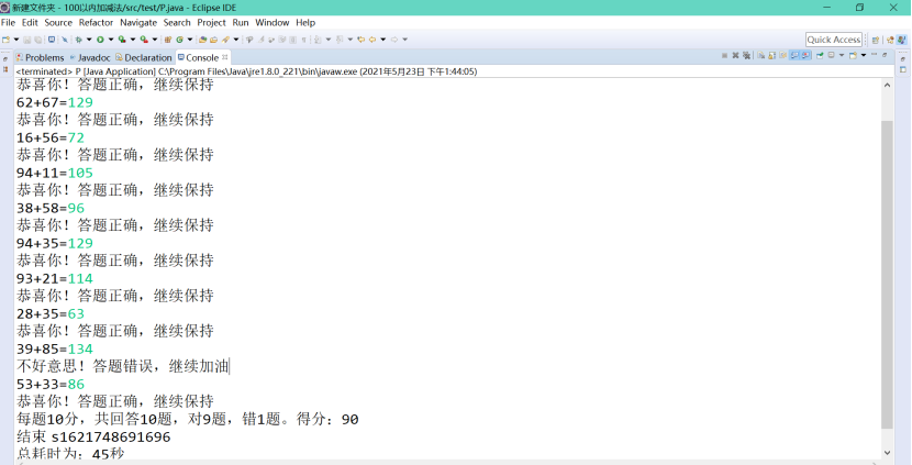 测试结果能达到最初的预期效果,随机产生10个100以内的算术题,并显示出来最后还能判断对错,并统计得分,以及统计所用时间。测试成功,还未发现其他bug。
