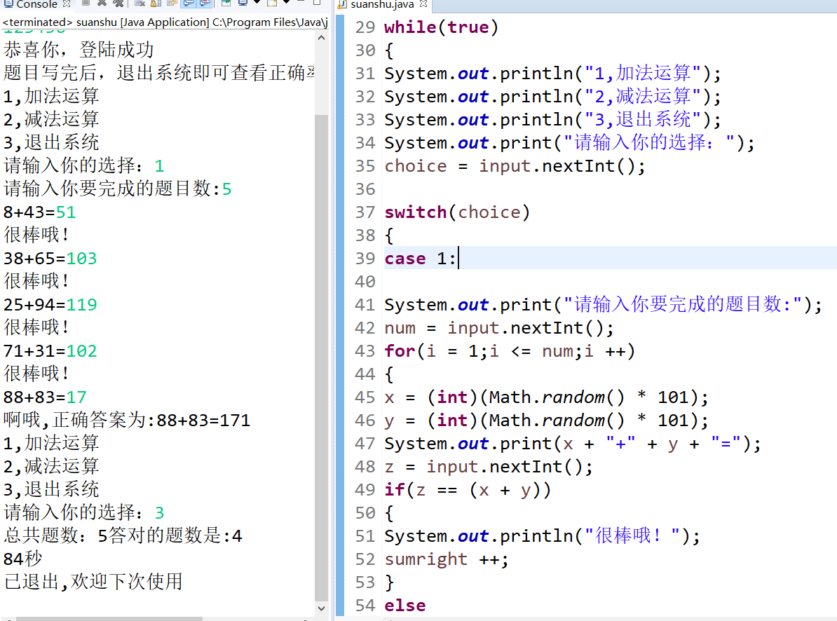 System.out.println("总共题数:" + sumall + "答对的题数是:" + sumright);