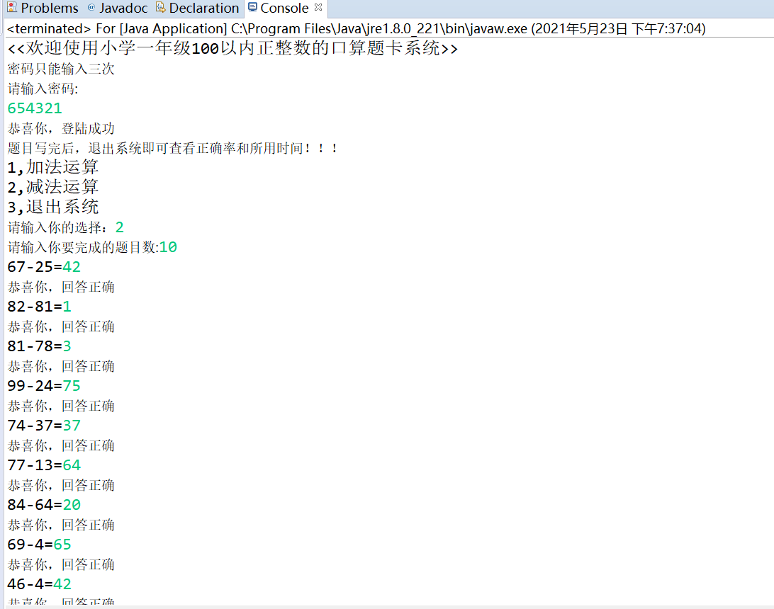 System.out.println("题目写完后,退出系统即可查看正确率和所用时间!!!");