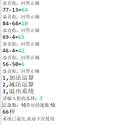 ④使用if语句来判断表达式结果是否正确,正确的话输出“恭喜你!回答正确”,错误的话则输出“回答错误,正确答案为。。。”,最后10道算术题做完之后显示正确率以及统计时间。