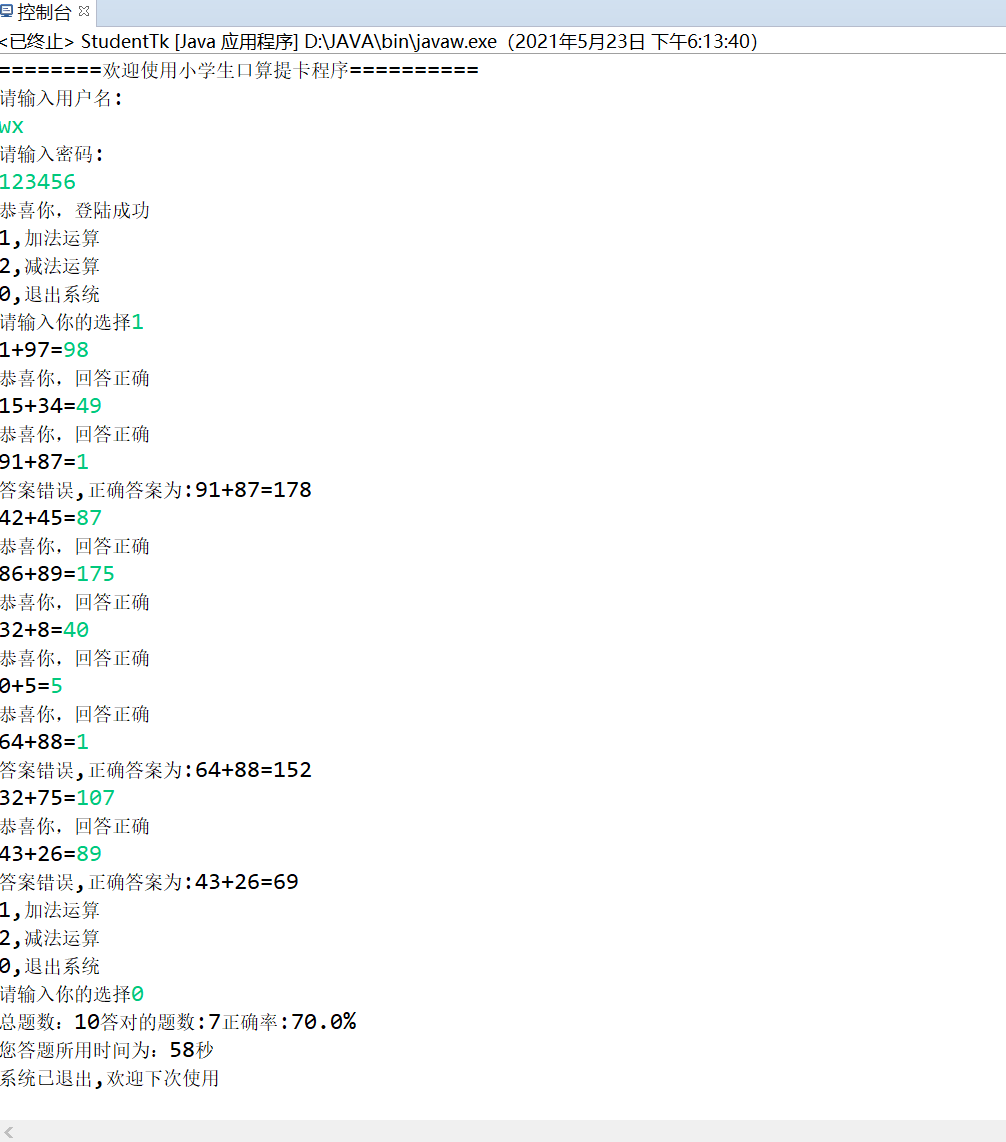 登录小学生提卡程序需要正确的用户名和密码,登录成功后选择加法题或减法题,做完后退出系统并显示出做的总题数,正确题数,正确率和所用的时间