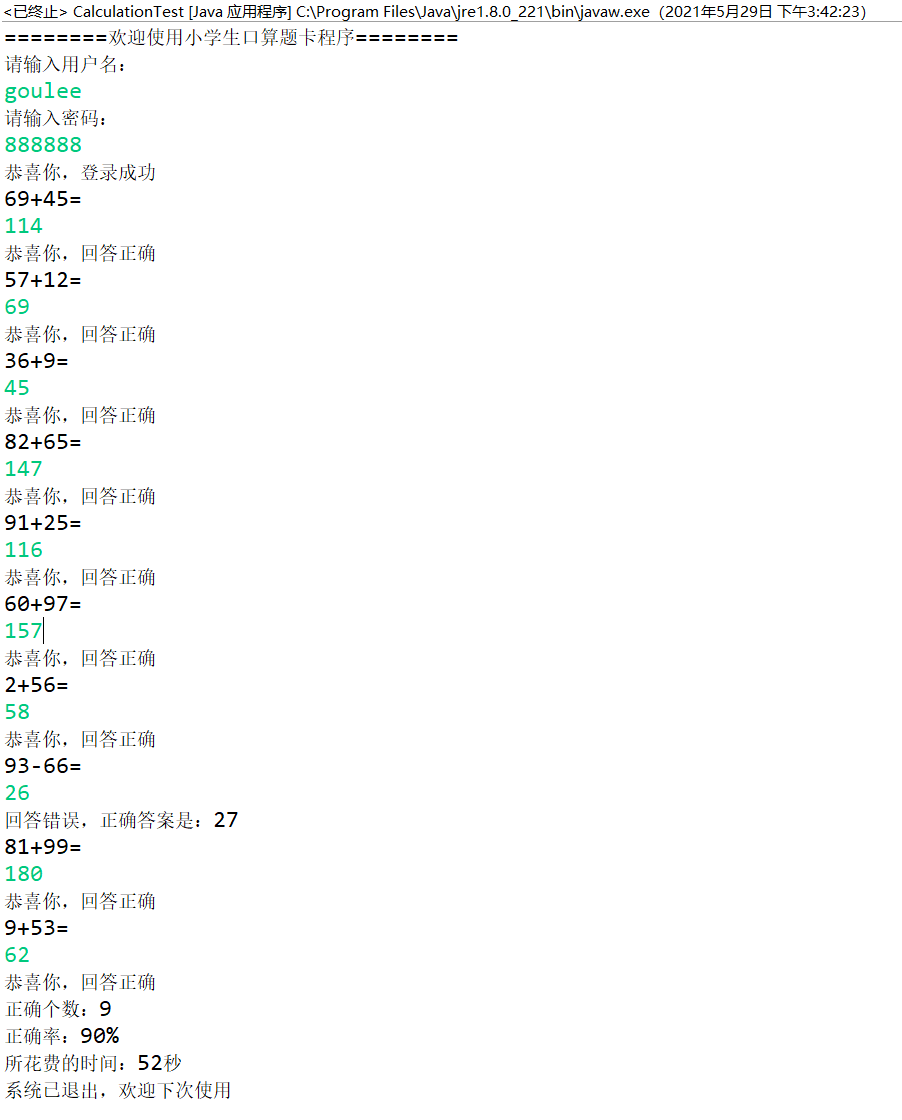 系统开始,随机产生10道加减法题,答对输出“恭喜你,回答正确”,答错输出“回答错误,正确答案是:”,计算完成后,显示正确题数,正确率以及所花费的时间,系统结束。