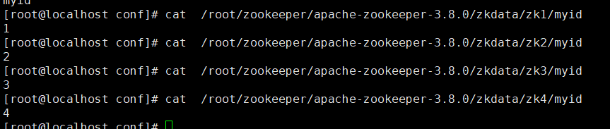 分别找到每个配置文件种的dataDir所指向的路径下创建myid,并分别设值为1、2 、3、4