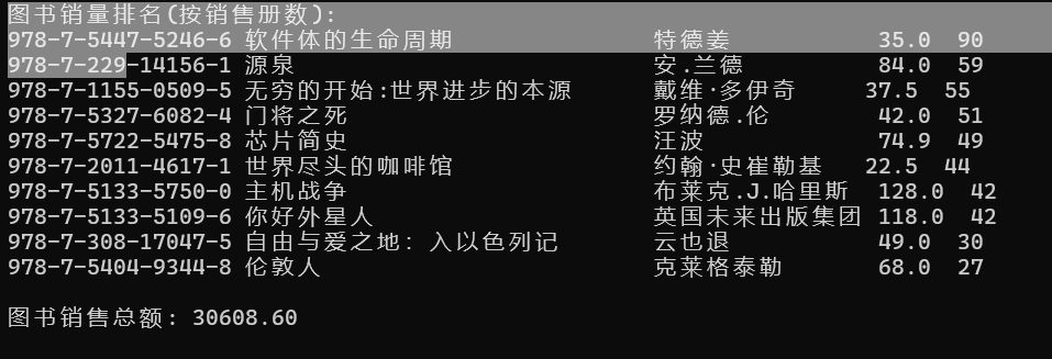 1 #include <stdio.h> 2 #define N 10 3 4 typedef struct { 5 char isbn[20]; // isbn号 6 char name[80]; // 书名 7 char author[80]; // 作者 8 double sales_price; // 售价 9 int sales_count; // 销售册数 10 } Book; 11 12 void output(Book x[], int n); 13 void sort(Book x[], int n); 14 double sales_amount(Book x[], int n); 15 16 int main() { 17 Book x[N] = {{"978-7-5327-6082-4", "门将之死", "罗纳德.伦", 42, 51}, 18 {"978-7-308-17047-5", "自由与爱之地:入以色列记", "云也退", 49 , 30}, 19 {"978-7-5404-9344-8", "伦敦人", "克莱格泰勒", 68, 27}, 20 {"978-7-5447-5246-6", "软件体的生命周期", "特德姜", 35, 90}, 21 {"978-7-5722-5475-8", "芯片简史", "汪波", 74.9, 49}, 22 {"978-7-5133-5750-0", "主机战争", "布莱克.J.哈里斯", 128, 42}, 23 {"978-7-2011-4617-1", "世界尽头的咖啡馆", "约翰·史崔勒基", 22.5, 44}, 24 {"978-7-5133-5109-6", "你好外星人", "英国未来出版集团", 118, 42}, 25 {"978-7-1155-0509-5", "无穷的开始:世界进步的本源", "戴维·多伊奇", 37.5, 55}, 26 {"978-7-229-14156-1", "源泉", "安.兰德", 84, 59}}; 27 28 printf("图书销量排名(按销售册数): \n"); 29 sort(x, N); 30 output(x, N); 31 32 printf("\n图书销售总额: %.2f\n", sales_amount(x, N)); 33 34 return 0; 35 } 36 37 // 待补足:函数output()实现 38 void output(Book x[], int n){ 39 int i; 40 for(i=0;i<n;i++){ 41 printf("%s %-30s %-16s %-3.1lf %3d\n",x[i].isbn,x[i].name,x[i].author,x[i].sales_price,x[i].sales_count); 42 } 43 } 44 45 46 // 待补足:函数sort()实现 47 void sort(Book x[], int n){ 48 int i,j; 49 Book t; 50 for(i=0;i<n-1;i++){ 51 for(j=0;j<n-1-i;j++){ 52 if(x[j].sales_count<x[j+1].sales_count){ 53 t=x[j]; 54 x[j]=x[j+1]; 55 x[j+1]=t; 56 } 57 } 58 } 59 } 60 61 62 // 待补足:函数sales_count()实现 63 double sales_amount(Book x[], int n){ 64 double sum=0; 65 int i; 66 for(i=0;i<n;i++){ 67 sum=sum+x[i].sales_price*x[i].sales_count; 68 } 69 return sum; 70 }