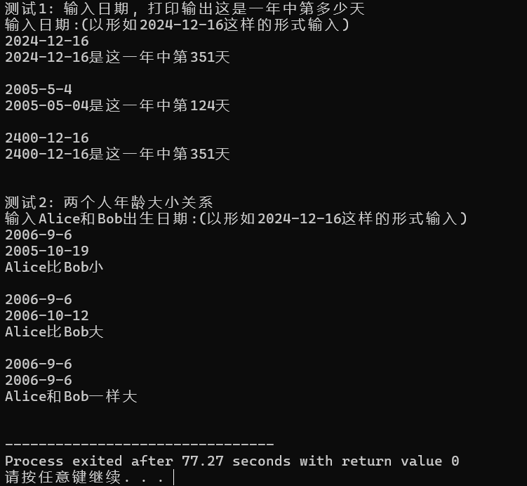 1 #include <stdio.h> 2 3 typedef struct { 4 int year; 5 int month; 6 int day; 7 } Date; 8 9 // 函数声明 10 void input(Date *pd); // 输入日期给pd指向的Date变量 11 int day_of_year(Date d); // 返回日期d是这一年的第多少天 12 int compare_dates(Date d1, Date d2); // 比较两个日期: 13 // 如果d1在d2之前,返回-1; 14 // 如果d1在d2之后,返回1 15 // 如果d1和d2相同,返回0 16 17 void test1() { 18 Date d; 19 int i; 20 21 printf("输入日期:(以形如2024-12-16这样的形式输入)\n"); 22 for(i = 0; i < 3; ++i) { 23 input(&d); 24 printf("%d-%02d-%02d是这一年中第%d天\n\n", d.year, d.month, d.day, day_of_year(d)); 25 } 26 } 27 28 void test2() { 29 Date Alice_birth, Bob_birth; 30 int i; 31 int ans; 32 33 printf("输入Alice和Bob出生日期:(以形如2024-12-16这样的形式输入)\n"); 34 for(i = 0; i < 3; ++i) { 35 input(&Alice_birth); 36 input(&Bob_birth); 37 ans = compare_dates(Alice_birth, Bob_birth); 38 39 if(ans == 0) 40 printf("Alice和Bob一样大\n\n"); 41 else if(ans == -1) 42 printf("Alice比Bob大\n\n"); 43 else 44 printf("Alice比Bob小\n\n"); 45 } 46 } 47 48 int main() { 49 printf("测试1: 输入日期, 打印输出这是一年中第多少天\n"); 50 test1(); 51 52 printf("\n测试2: 两个人年龄大小关系\n"); 53 test2(); 54 } 55 56 // 补足函数input实现 57 // 功能: 输入日期给pd指向的Date变量 58 void input(Date *pd) { 59 scanf("%d-%d-%d", &pd->year, &pd->month, &pd->day); 60 } 61 62 // 补足函数day_of_year实现 63 // 功能:返回日期d是这一年的第多少天 64 int day_of_year(Date d) { 65 int ping[]={0,31,28,31,30,31,30,31,31,30,31,30}; 66 int sum=0,i; 67 if (d.year%4==0&&(d.year%100!=0||d.year%400==0)){ 68 ping[2]=29; 69 } 70 for (i=0;i<d.month;i++) { 71 sum=sum+ping[i]; 72 } 73 return sum+d.day; 74 } 75 76 // 补足函数compare_dates实现 77 // 功能:比较两个日期: 78 // 如果d1在d2之前,返回-1; 79 // 如果d1在d2之后,返回1 80 // 如果d1和d2相同,返回0 81 int compare_dates(Date d1, Date d2) { 82 if(d1.year>d2.year){ 83 return 1;} 84 else if(d1.year<d2.year){ 85 return -1; 86 } 87 else{ 88 if(day_of_year(d1)>day_of_year(d2)){ 89 return 1; 90 } 91 else if(day_of_year(d1)==day_of_year(d2)){ 92 return 0; 93 } 94 else 95 return -1; 96 } 97 }