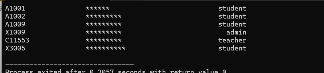 1 #include <stdio.h> 2 #include <string.h> 3 4 enum Role {admin, student, teacher}; 5 6 typedef struct { 7 char username[20]; // 用户名 8 char password[20]; // 密码 9 enum Role type; // 账户类型 10 } Account; 11 12 13 // 函数声明 14 void output(Account x[], int n); // 输出账户数组x中n个账户信息,其中,密码用*替代显示 15 16 int main() { 17 Account x[] = {{"A1001", "123456", student}, 18 {"A1002", "123abcdef", student}, 19 {"A1009", "xyz12121", student}, 20 {"X1009", "9213071x", admin}, 21 {"C11553", "129dfg32k", teacher}, 22 {"X3005", "921kfmg917", student}}; 23 int n; 24 n = sizeof(x)/sizeof(Account); 25 output(x, n); 26 27 return 0; 28 } 29 30 // 待补足的函数output()实现 31 // 功能:遍历输出账户数组x中n个账户信息 32 // 显示时,密码字段以与原密码相同字段长度的*替代显示 33 void output(Account x[], int n) { 34 int i,j,t; 35 for(i=0;i<n;i++){ 36 printf("%-20s\t",x[i].username); 37 t=strlen(x[i].password); 38 for(j=0;j<t;j++){ 39 printf("*"); 40 } 41 printf("\t"); 42 if (x[i].type==admin){ 43 printf("%20s\n","admin"); 44 } 45 else if (x[i].type==student){ 46 printf("%20s\n","student"); 47 } 48 else if (x[i].type==teacher){ 49 printf("%20s\n","teacher"); 50 } 51 } 52 }