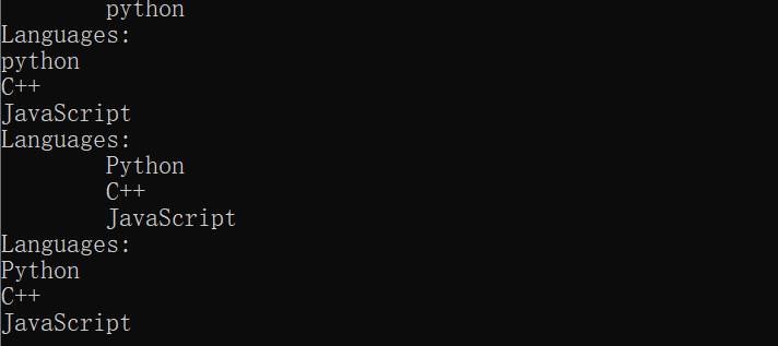1 print("\tpython") 2 #\t表示在字符串前空4个字符,也称缩进,当于tab键; 3 print("Languages:\npython\nC++\nJavaScript") 4 #\n表示换行,相当于回车键 5 print("Languages:\n\tPython\n\tC++\n\tJavaScript") 6 #字符串'\n\t'让Python换到下一行,并在下一行开头添加制表符 7 print("Languages:\t\nPython\t\nC++\t\nJavaScript") 8 #字符串'\t\n'的效果等于字符组合'\n',不推荐使用