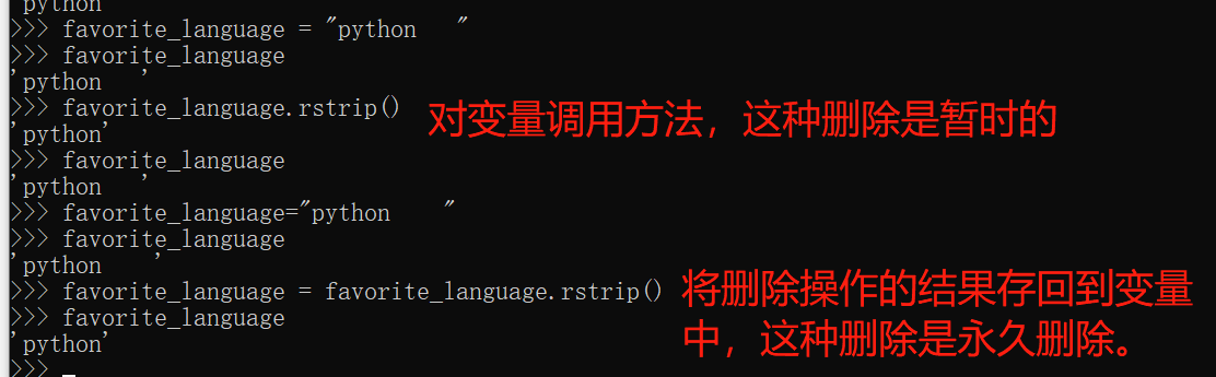 ##注意:直接对变量调用方法rstrip()、lstrip()、strip()来删除字符串末尾、开头、两端的空白,这种删除方式的效果是暂时的;要想永久删除字符串末尾、开头、两端的空白,需要将删除操作的结果存回到变量中。