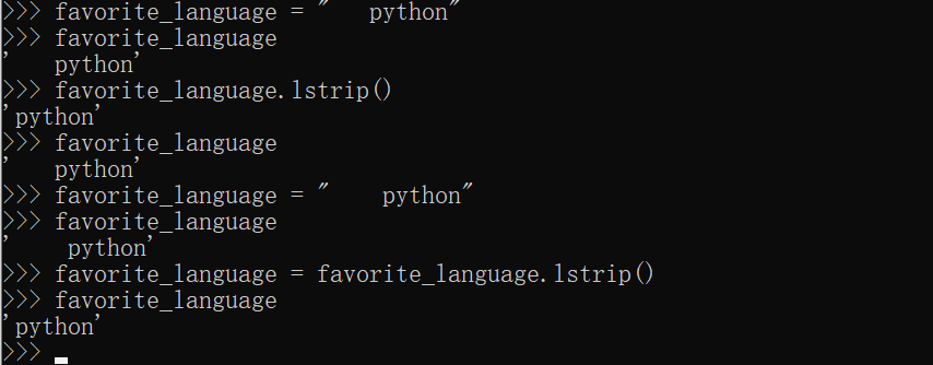 #.2方法lstrip():(移除左边的空格,去掉前面空白字符)确保字符串开头没有空白,直接对变量调用方法lsrtip()对字符串开头空白删除是暂时的,要永久删除某个字符串开头的空白,必须将删除操作的结果存回到变量中。如以下示例: