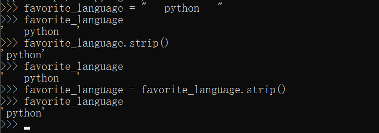 #.3方法strip():确保字符串两端没有空白,直接对变量调用方法srtip()对字符串两端空白删除是暂时的,要永久删除某个字符串两端的空白,必须将删除操作的结果存回到变量中。如以下示例: