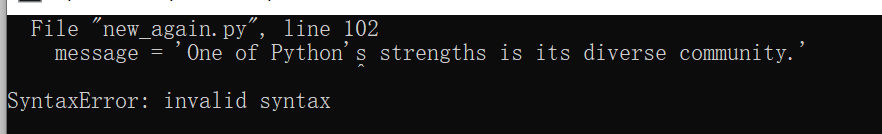 1 message = "One of Python's strengths is its diverse community." 2 print(message) 3 message = 'One of Python's strengths is its diverse community.' 4 #可以很明显的看到编译器将第一个单引号与撇号之间的内容视为了一个字符串,将余下的文本视为了Python代码 5 print(message)