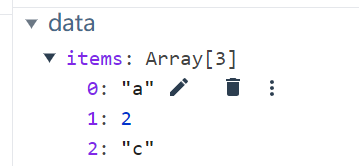 add() { this.$set(this.items, 1, 2) console.log(this.items); }, 修改后的结果