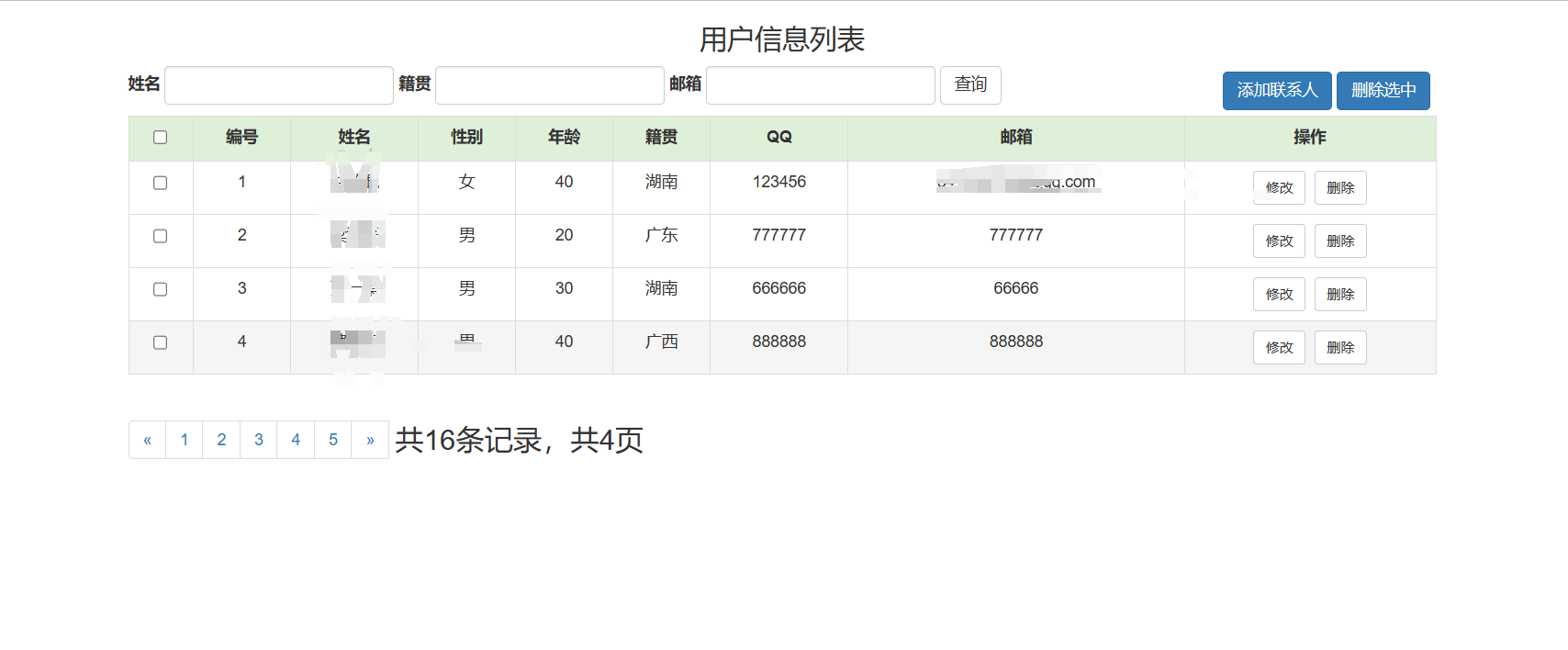 今天终于写出了一个小模块的增删改查操作,看了黑马的视频,敲了很多次键盘,终于搞得差不多了,还差一些按条件查询的正在学。目前的只是对用信息的增删改查,这几天弄完之后就着手作业了,