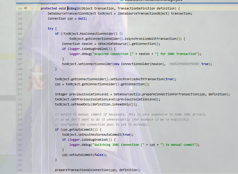 if (isExistingTransaction(transaction)) 为假,就跳过走到下面的代码,开始事务,为最新事务(老大事务),开启事务的同事,会创立一个新的连接,connection
