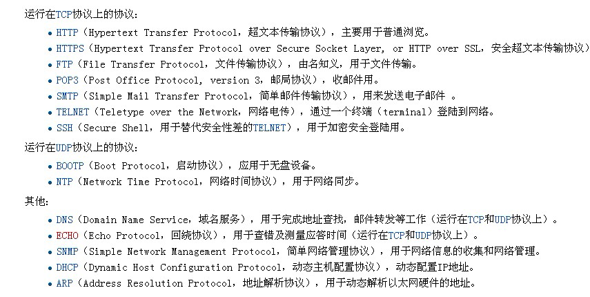 应用层协议:FTP、Telnet、SMTP、HTTP、RIP、NFS、DNS。
