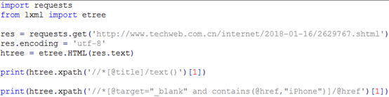 第1个xpath语句的作用是提取所有带title参数的标签框起来的文字;第2个xpath语句的作用是提取所有target参数值为_blank,并且href参数值包含iPhone的标签所属href参数值。运行结果如下: