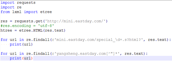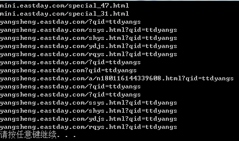 第1个表达式的作用是选出所有special_后面带数字和html后缀的链接;第2个表达式的作用是选出host是yangsheng.eastday.com的链接(完整链接由一对半角双引号括起来),运行结果如下: