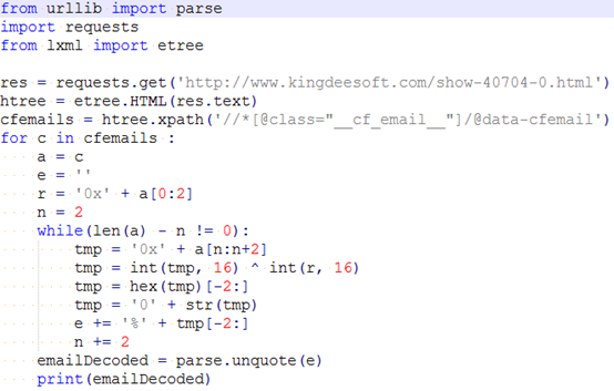 其中xpath语句的作用是提取带加密邮箱的标签,并把加密后编码提取出来。运行结果如下: