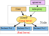 - Load Balancer将流量分发到后端多个主机节点上的NodePort (userspace转发)