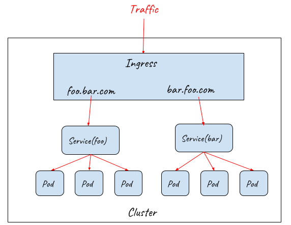 - 按HTTP请求的Host进行路由 同一个IP进来的流量可以根据HTTP请求的Host路由到Cluster中的不同服务,如下图所示: