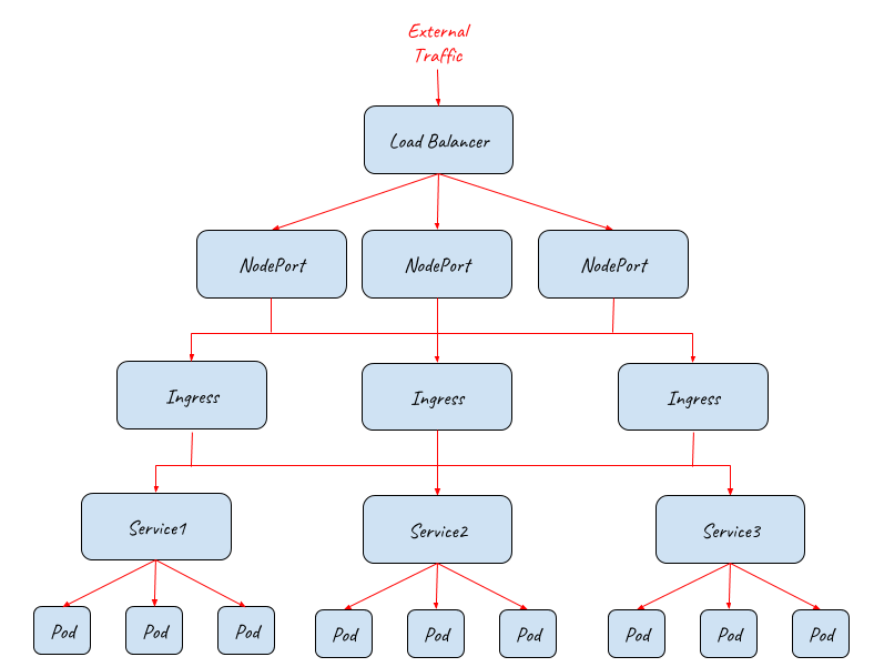 上图描述了如何采用Ingress配合NodePort和Load Balancer为集群提供外部流量入口,从该拓扑图中可以看到该架构的伸缩性非常好,在NodePort,Ingress,Pod等不同的接入层面都可以对系统进行水平扩展,以应对不同的外部流量要求