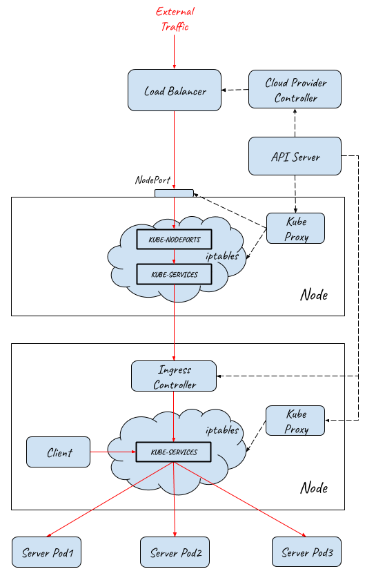 - 请求从NodePort进入到Ingress Controller (iptabes规则,Ingress Controller本身是一个NodePort类型的Service)