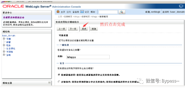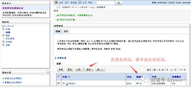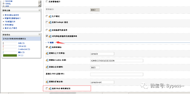以下复现是在Weblogic开发模式下进行的,若需在生产模式下进行复现,则需要 登录后台页面,点击base_domain的配置,在”高级”设置中 开启 “启用 Web 服务测试页” 选项,经过我的验证发现开启之后,不仅需要账号密码登陆,即使登陆了也没有这两处上传点。
