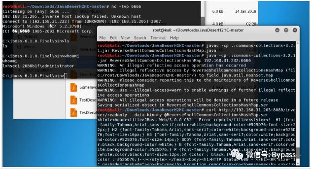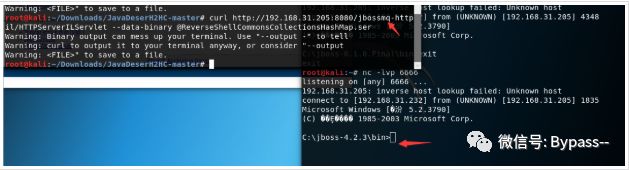 其中,[victim ip]和[victim port]是目标weblogic的IP和端口,[path to ysoserial]是本地(Kail系统上的)ysoserial的路径,[JRMPListener ip]和[JRMPListener port]第一步中启动JRMP Server的IP地址和端口。[JRMPClient]是执行JRMPClient的类,可选的值是JRMPClient或JRMPClient2