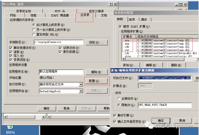 从网站属性->主目录->配置 可以看出,他们都是调用了asp.dll进行的解析。