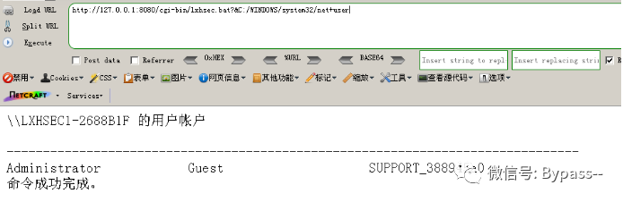 Payload执行的命令是 net user lxh lxh /add,效果如下: