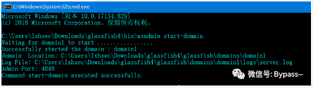 解压后,进入glassfish/bin目录下打开CMD窗口输入asadmin start-domain启动glassfish